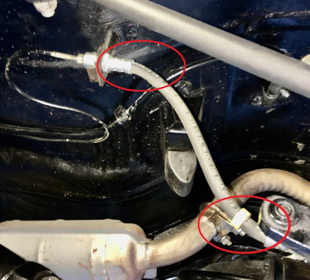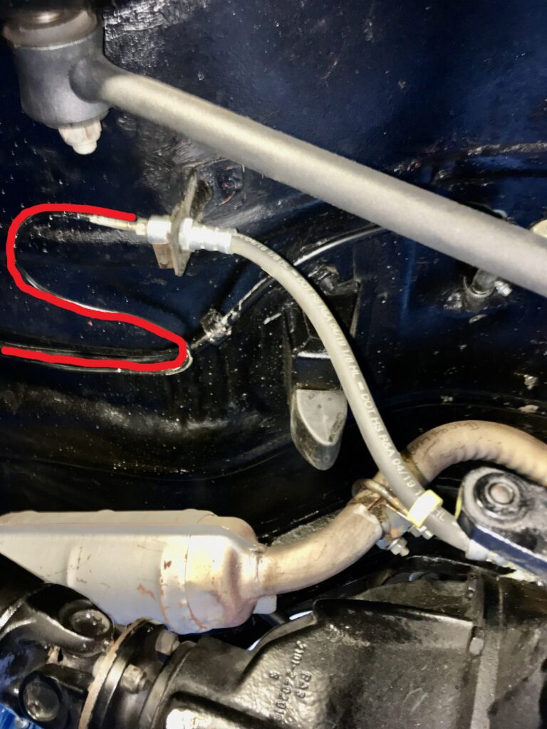 Von links ins Bild kommt die Bremsleitung von vorne vom Hauptbremszylinder, mit einem S-Schlag geht die Leitung dann direkt auf die Hinterachse. Die Leitung die man daneben laufen sieht ist keine Bremsleitung sondern die Benzinleitung zum Tank.