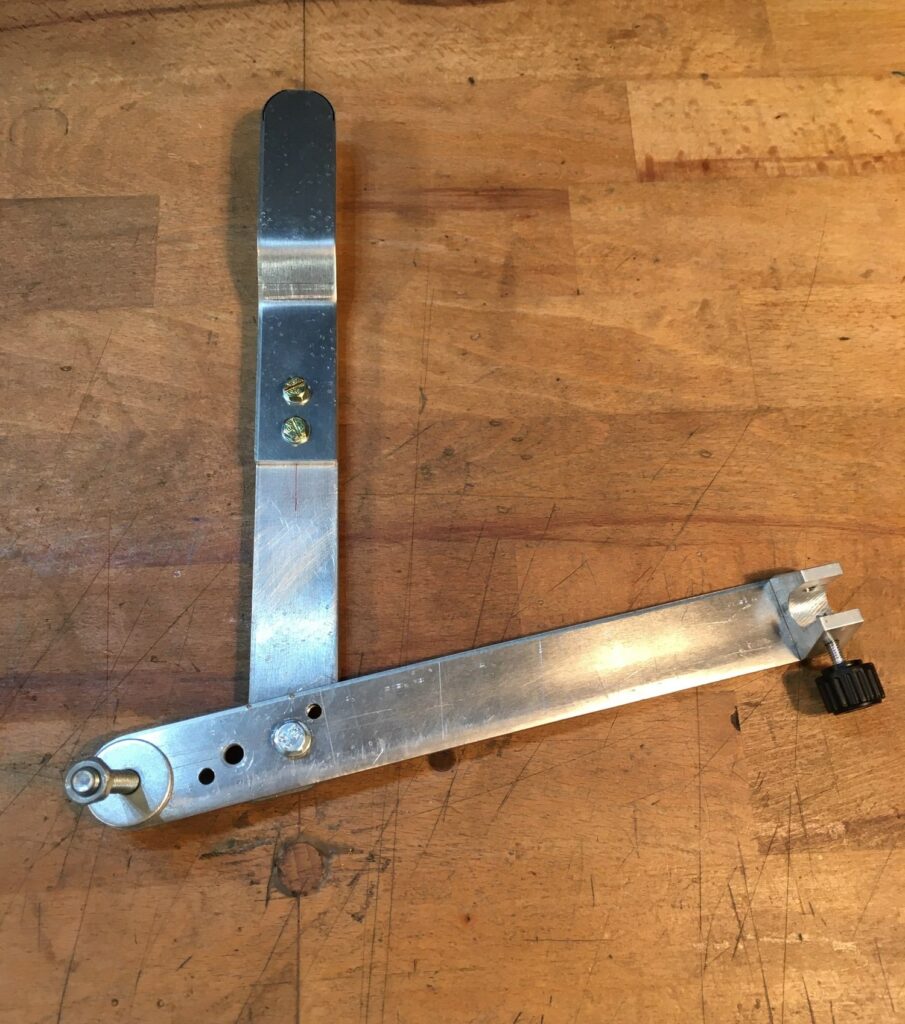 Meine Einstellehre habe ich aus 2mm Aluminiumblech hergestellt. Die Klemmung (rechts) ist ein Frästeil aus Alu – etwas Luxus darf nach dem Ärger mit den Bremsleitungen nicht fehlen, zudem machen solches Details Werkzeuge einfach schöner!