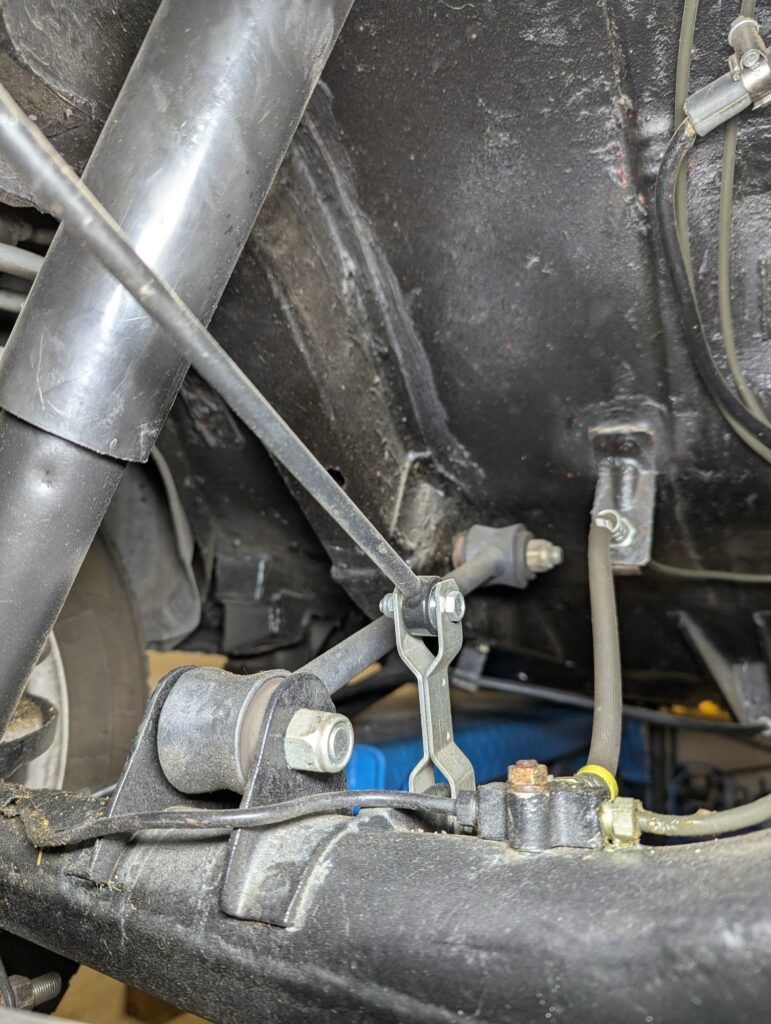 Die Lehre wird nun einfach mit der M6 Schraube vorne in das Auge in dem sonst der Koppellenker sitzt gesteckt und hinten über den Klemmblock am Gestänge gehalten. So montiert wird die Lehre nun nach oben gegen den Fahrzeugboden gedrückt.
